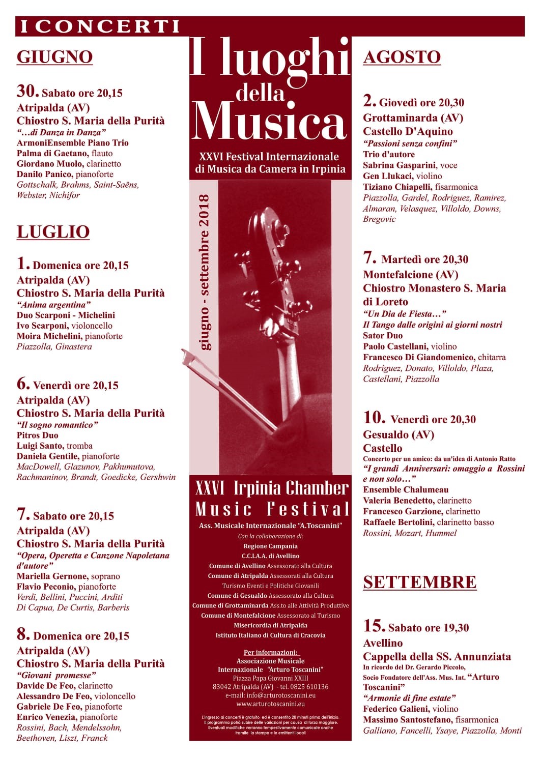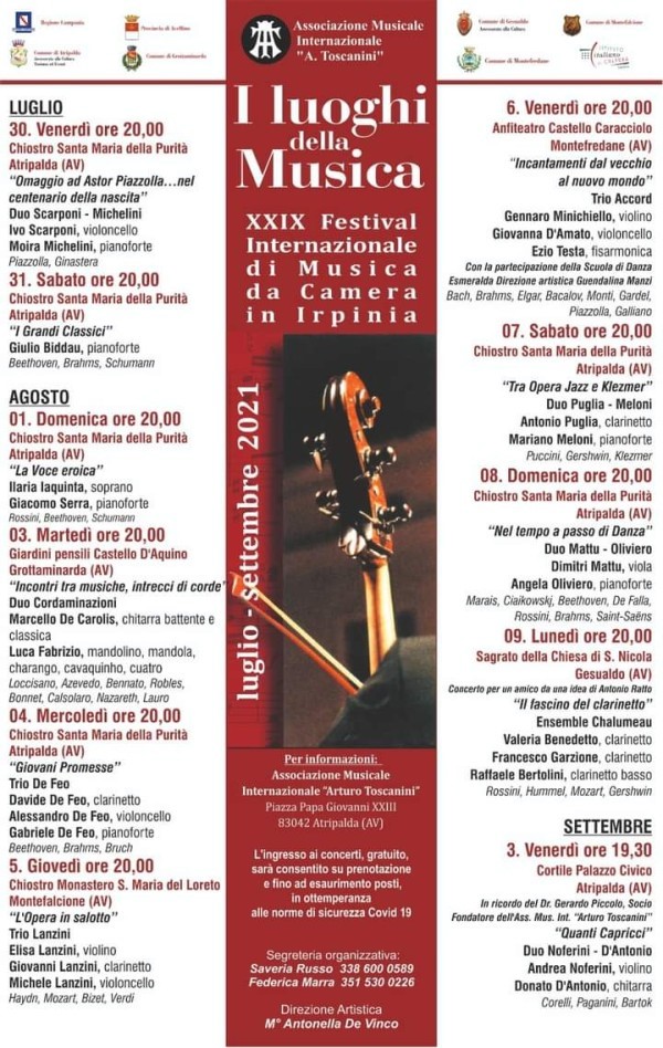 “International Chamber Music Festival in Irpinia”, scheduled in the summer. Prestigious Chamber Music Festival organized in the Province by the International Music Association “A.Toscanini”. The event takes place on several dates during the summer and involves various places in the Irpinia area