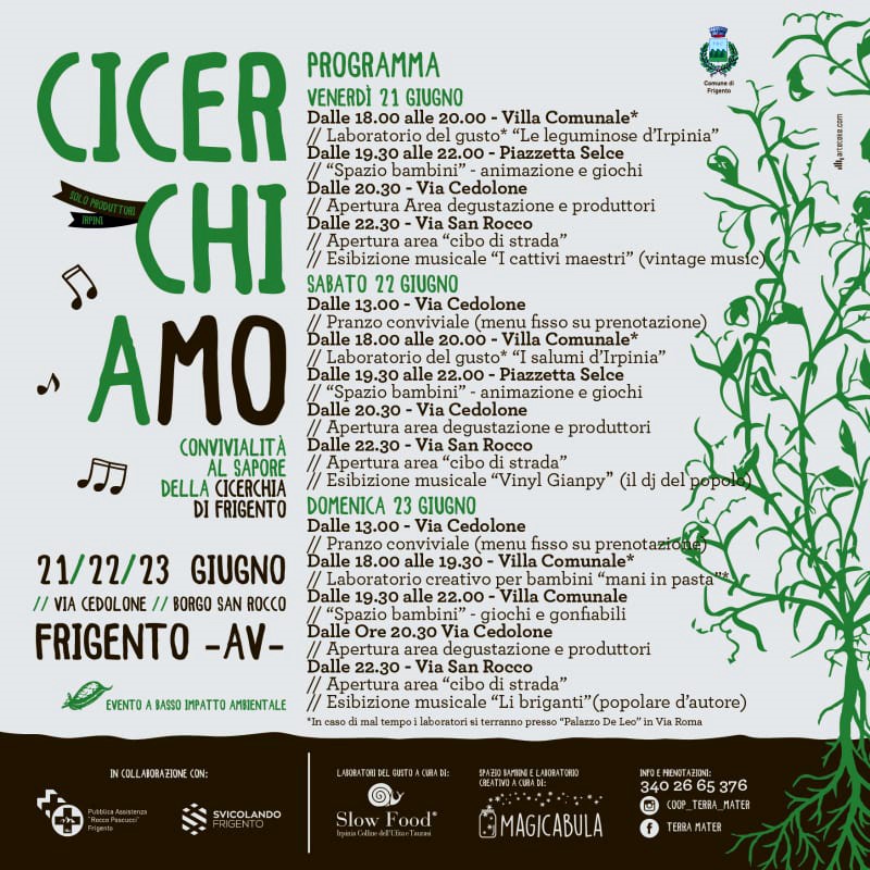 Appuntamento imperdibile per gli amanti dei prodotti tipici locali, Cicerchiamo contribuisce ad arricchire l'offerta culturale ed enogastronomica del territorio frigentino, attraverso la valorizzazione di un legume tipico della biodiversità locale Cicerchiamo è un evento enogastronomico che si svolge a Frigento, nel periodo estivo. Promosso dalla cooperativa sociale Terra Mater e da Slow Food, l'evento intende promuovere la cicerchia, legume tipico della biodiversità locale e particolarmen leggi di più